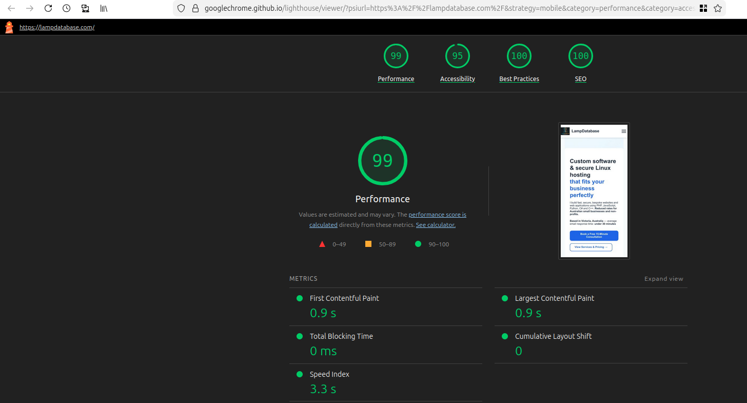 Here is the Lighthouse summary for this website. This is a bespoke PHP based site just like the one I would create for you! This is running on a US$2.50 a month Debian Linux Vultr VPS in Sydney.